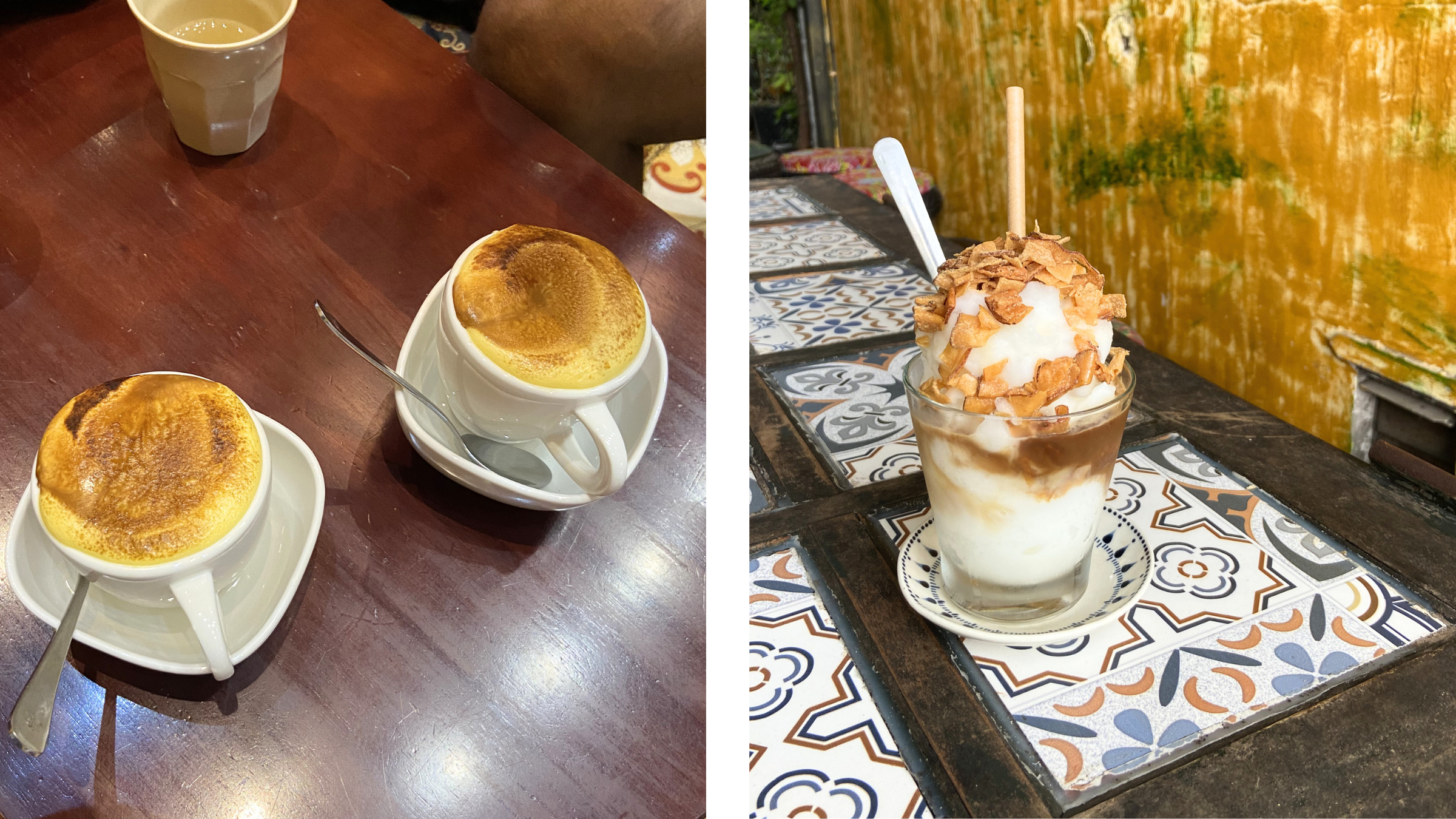 Egg coffees at Vi Anh and Coconut coffee at Hidden Gem Café